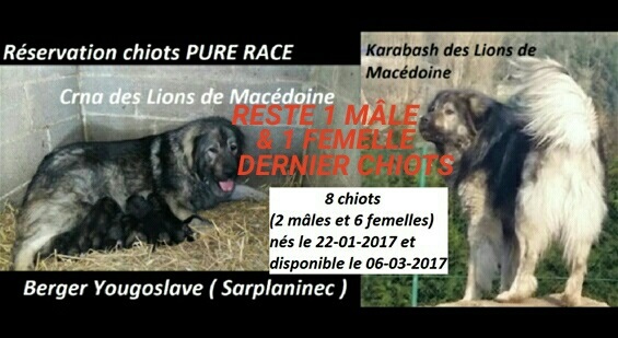 8 CHIOTS VENDUS PARENTS sont: CRNA & KARABASH + 6 CHIOTS DE SARA ET SIMBA 26-01-2017 TOUS VENDUS + 6 chiots MALES nés le 12-08-2017 SONT TOUS VENDUS - PARENTS: SIMBA & MECA